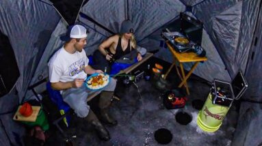 Ice Tenting & Fishing with a Contemporary meal and BIG FISH!!! (Underwater Footage!!)