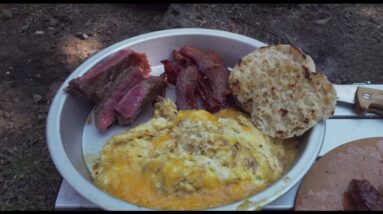 Steak & Eggs + Bacon! Cooked Over A Wooden Fired Firebox Range. Tenting Meals