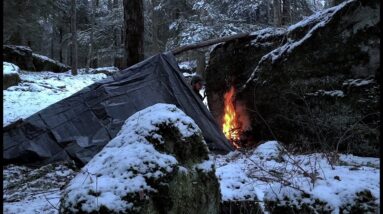 SOLO Winter Tenting in Snow – Deep Woods, Low cost Tarp/Massive Rock Shelter, Swedish Torch Cooking